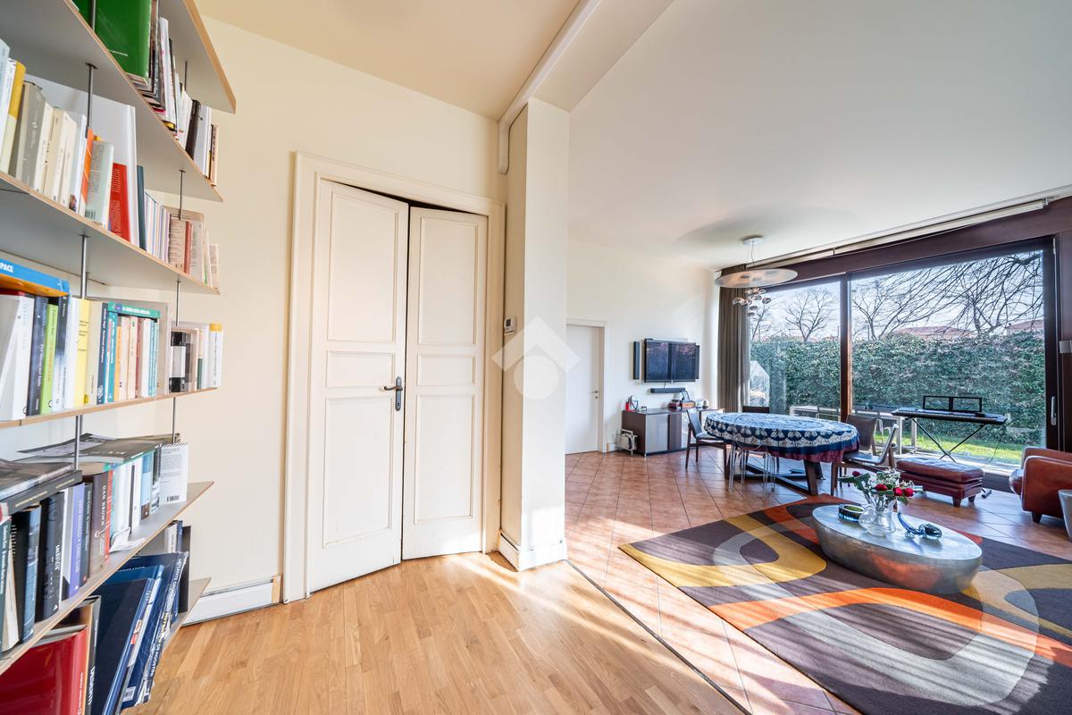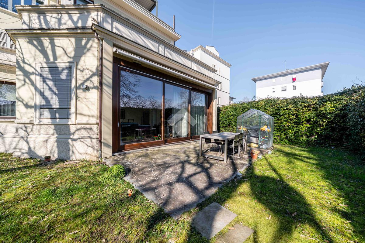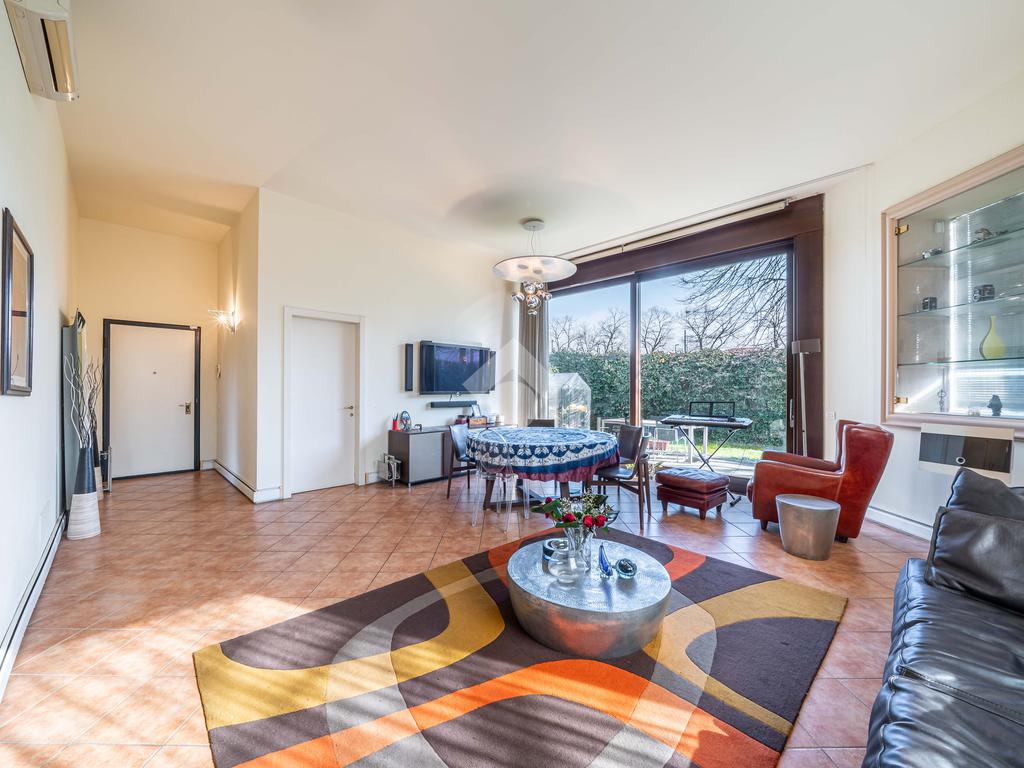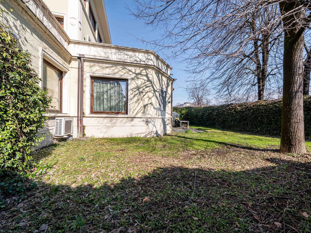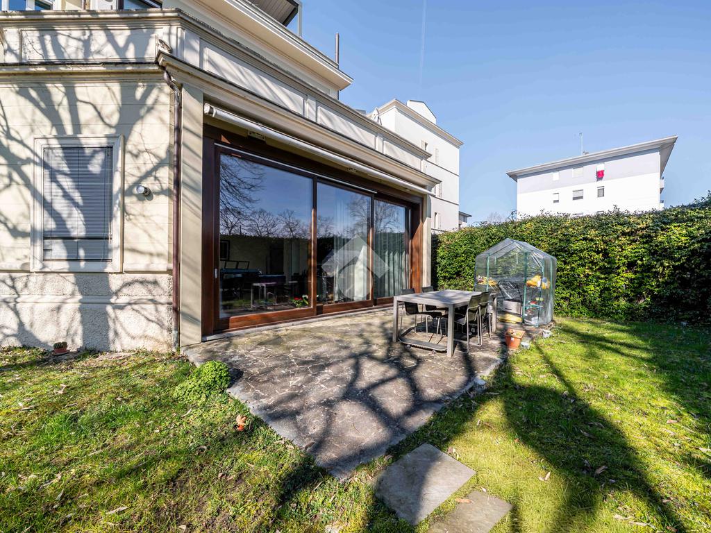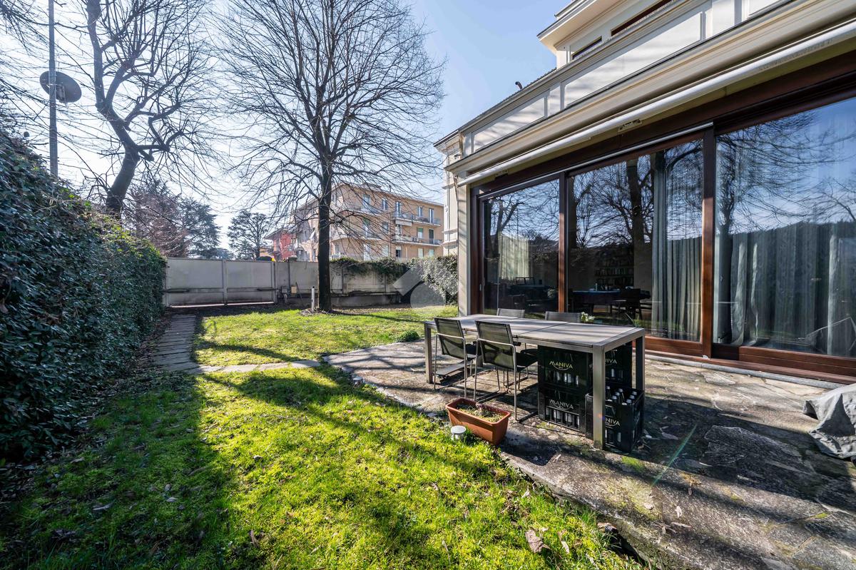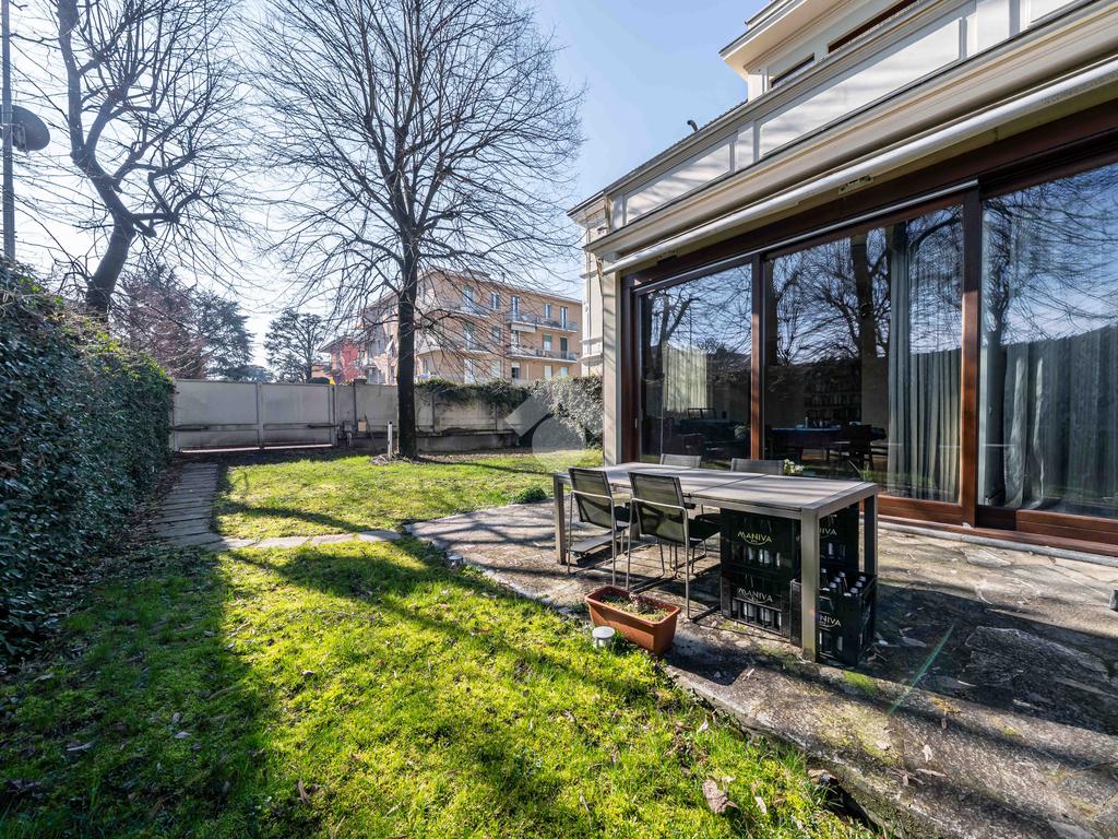 L’immobile è composto da un ampio soggiorno con vetrate di ottima manifattura a tutta altezza realizzate su misura che affaccia sul giardino, una cucina abitabile, una camera da letto matrimoniale dotata di cabina-armadio e di bagno in camera, un'altra camera da letto matrimoniale, un’ulteriore camera singola, un ulteriore bagno e una pratica lavanderia. Completano l’immobile un ampio giardino privato di 200mq, una cantina servita da ascensore e box auto.