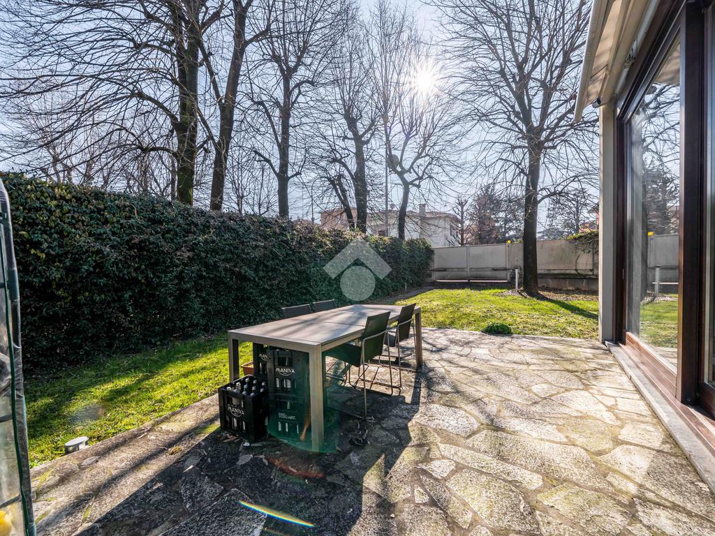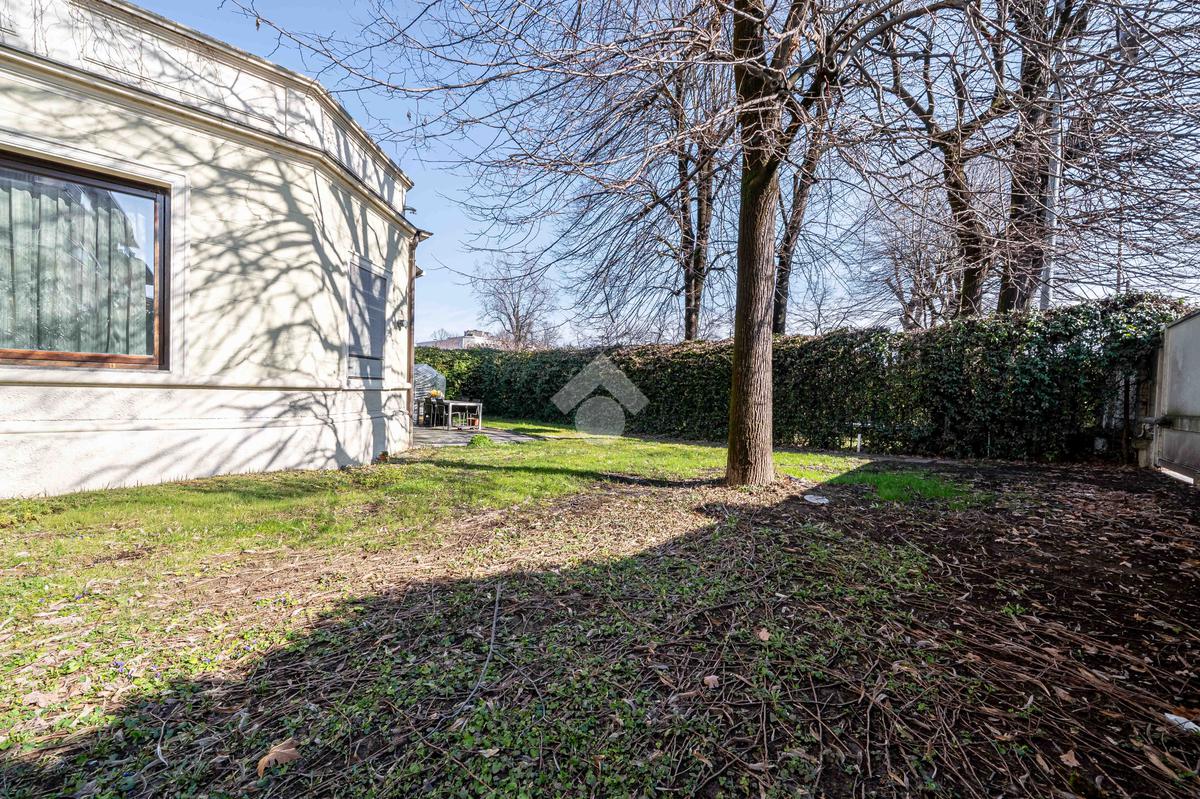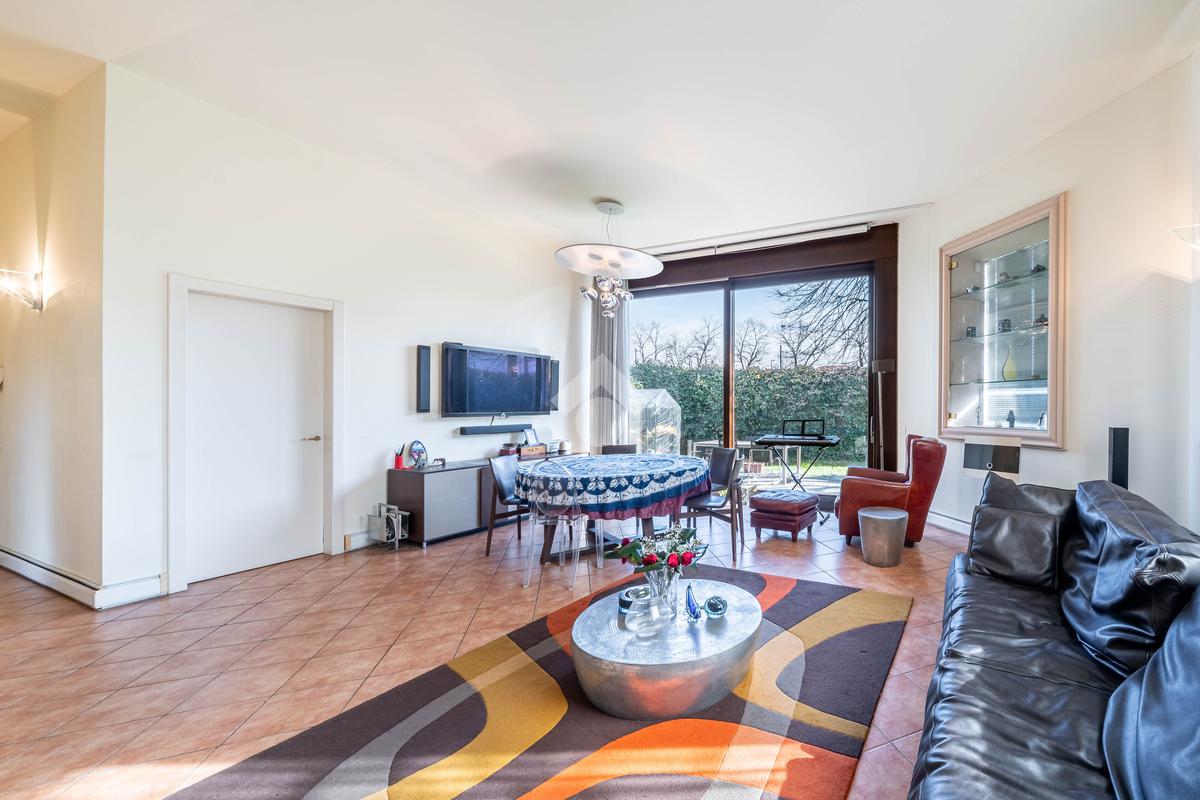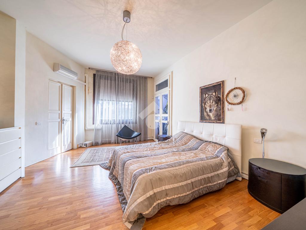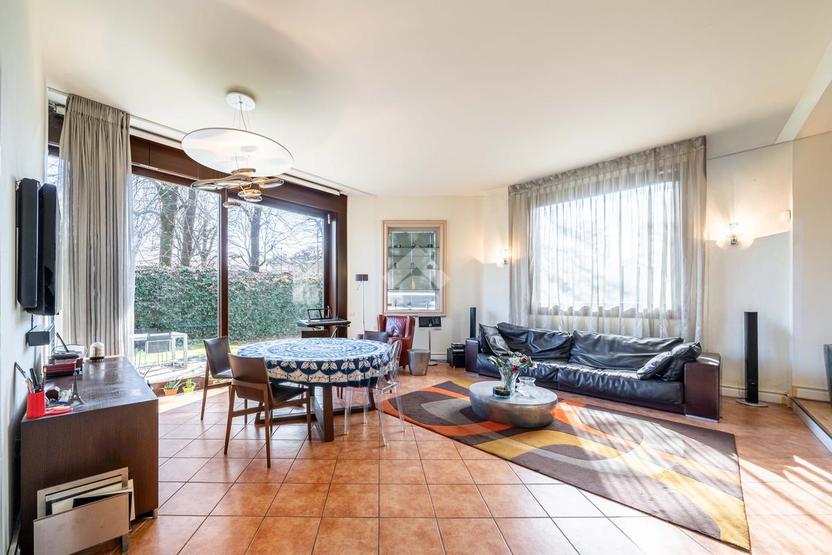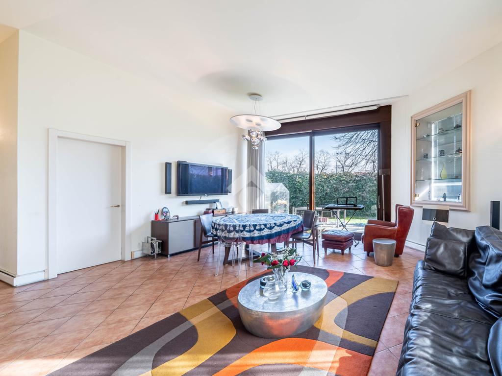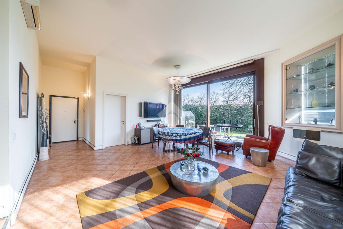 L’immobile è composto da un ampio soggiorno con vetrate di ottima manifattura a tutta altezza realizzate su misura che affaccia sul giardino, una cucina abitabile, una camera da letto matrimoniale dotata di cabina-armadio e di bagno in camera, un'altra camera da letto matrimoniale, un’ulteriore camera singola, un ulteriore bagno e una pratica lavanderia. Completano l’immobile un ampio giardino privato di 200mq, una cantina servita da ascensore e box auto.