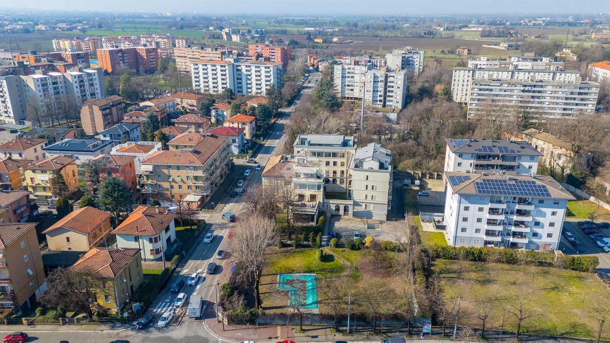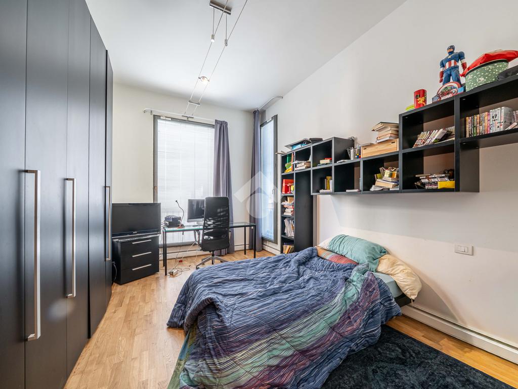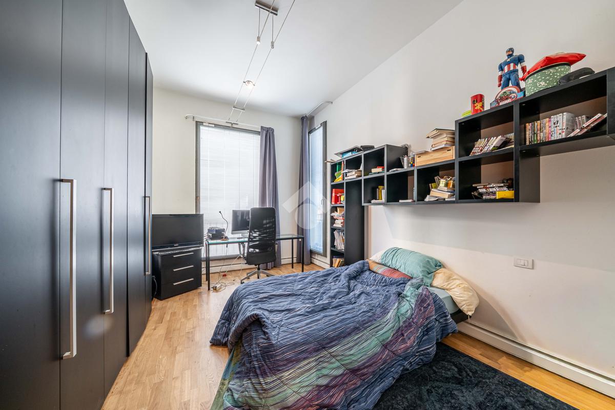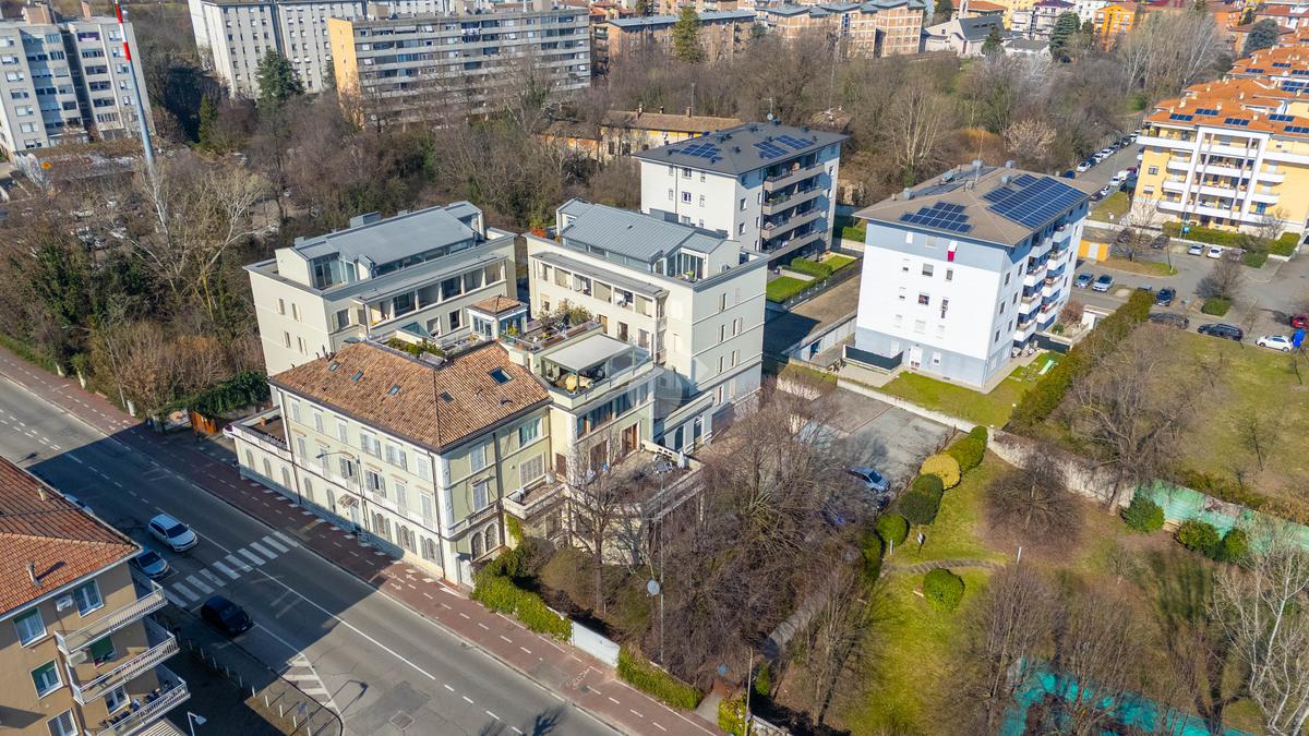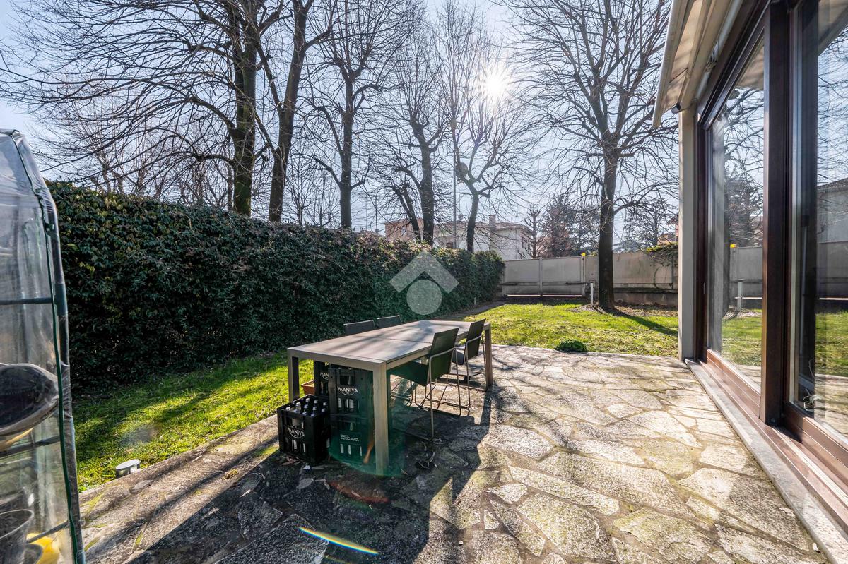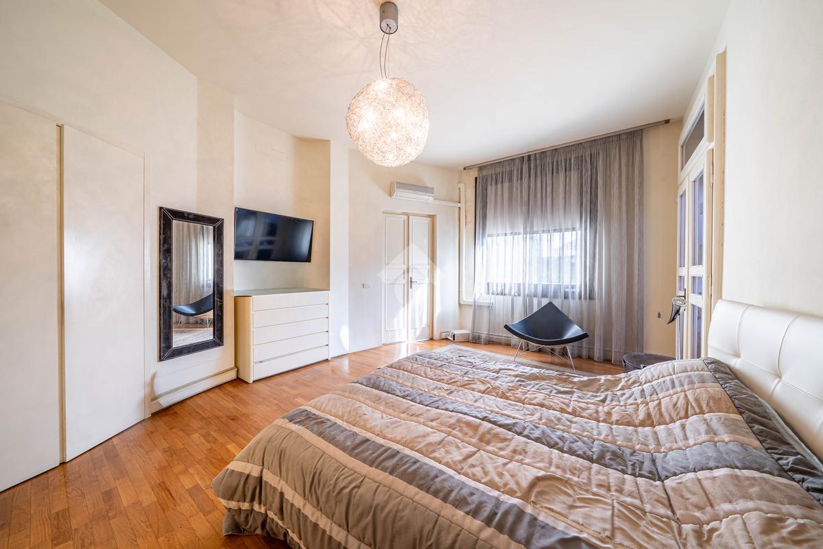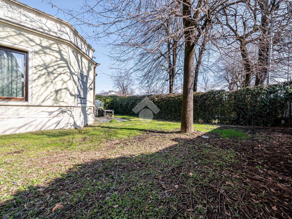 L’immobile è composto da un ampio soggiorno con vetrate di ottima manifattura a tutta altezza realizzate su misura che affaccia sul giardino, una cucina abitabile, una camera da letto matrimoniale dotata di cabina-armadio e di bagno in camera, un'altra camera da letto matrimoniale, un’ulteriore camera singola, un ulteriore bagno e una pratica lavanderia. Completano l’immobile un ampio giardino privato di 200mq, una cantina servita da ascensore e box auto.
