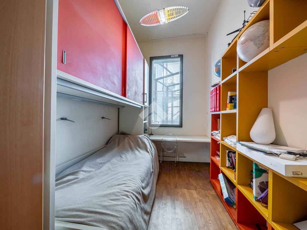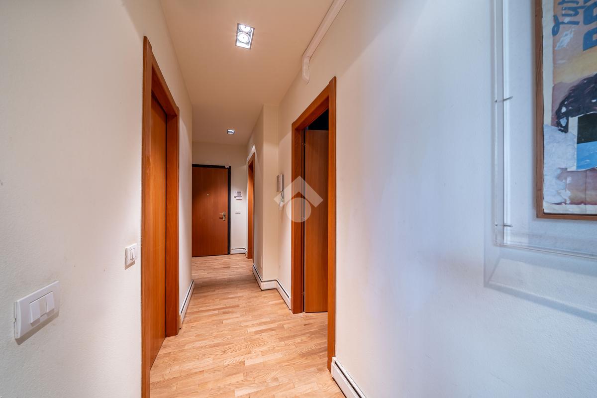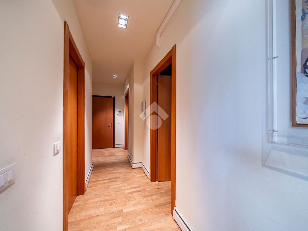 L’appartamento di circa 168 mq si sviluppa su un unico livello ed è dotato di due ingressi: uno indipendente e uno condominiale.